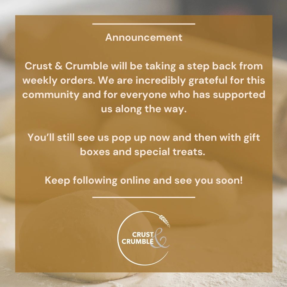 At Crust & Crumble, our passion for baking started in our grandmother's kitchen. Inspired by Nannie Beulah's love for feeding friends and family, we aim to share her warmth with our community. We offer a variety of sourdough products, specialty butters, and seasonal treats all available for special order and made fresh.